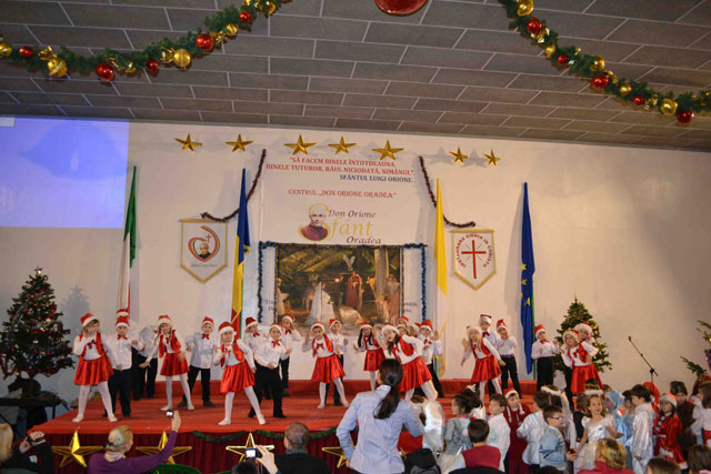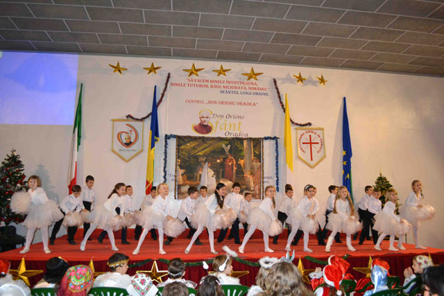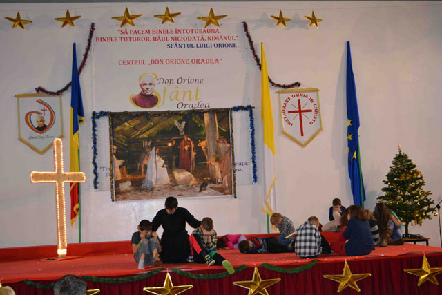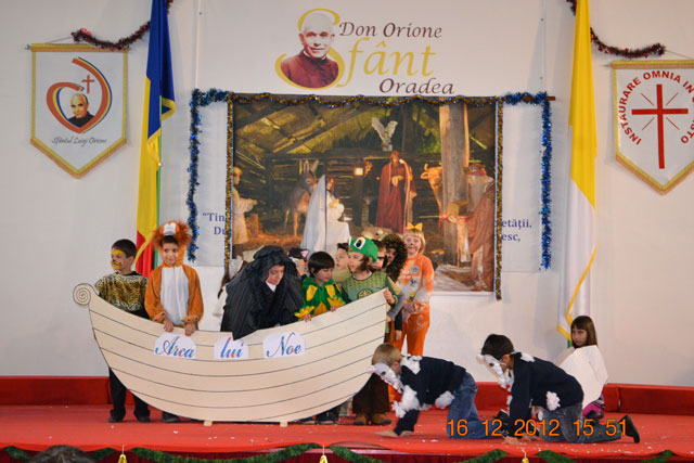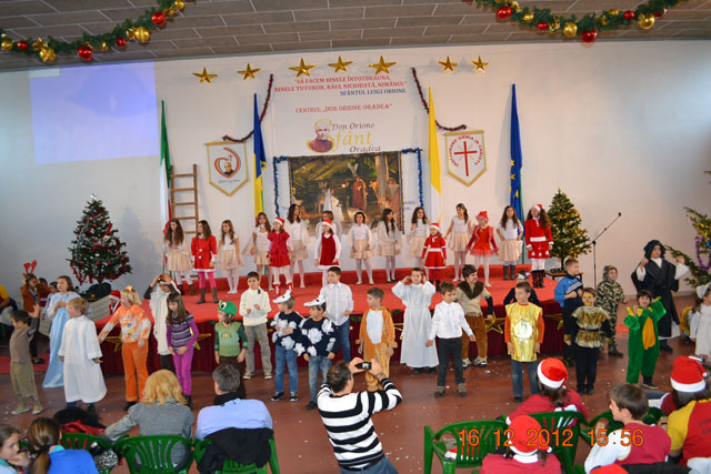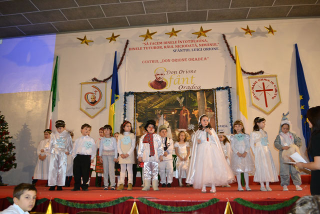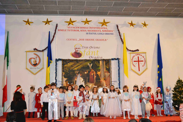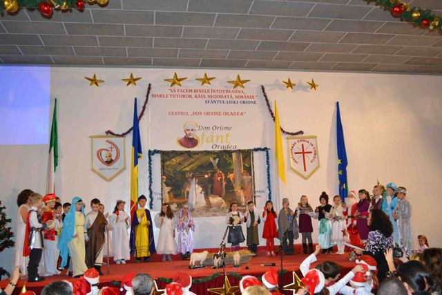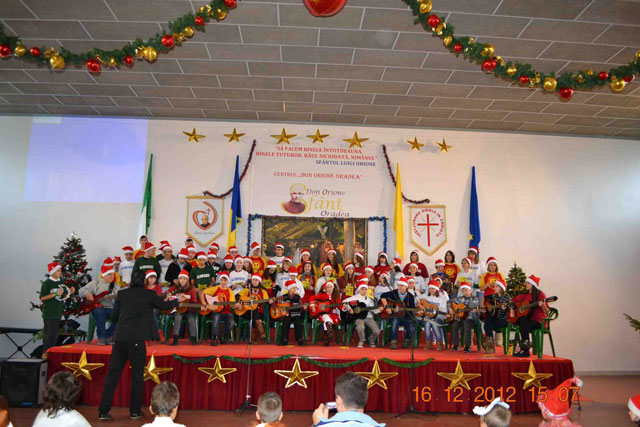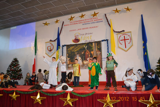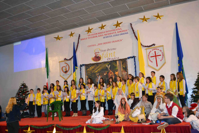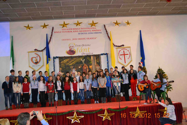 “Duminica, 16 decembrie 2012, la Centrul „Don Orione” din Oradea a avut loc o mare serbare, la fel ca în fiecare an, înainte de vacanta de Craciun. La ea au participat elevii claselor primare si gimnaziale, dar si copiii si adolescentii care frecventeaza grupele de Scout (Cercetasi) si Oratoriu de la Centrul „Don Orione”.