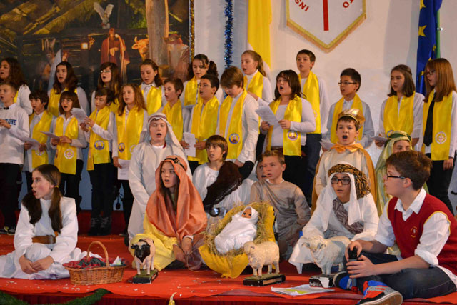 În continuare, au urcat pe scena cei mai mici elevi de la Don Orione, îndrumati de profesoarele Teodora Demeter si Janina Chinde. Ei au prezentat un scurt recital de versuri si muzica pe teme religioase si au realizat prin dans un frumos tablou de iarna. Emotiile au fost atât de mari, încât unul dintre copii, care interpreta un om de zapada, si-a spus poezia printre hohote de plâns, dar nu s-a lasat pâna nu a terminat ce avea de spus, în aplauzele celor din sala. Dupa acest moment, clericul Francisc i-a invitat pe toti cei prezenti sa cânte un cântec îndragit de multa lume, „Dumnezeu e taria mea”.