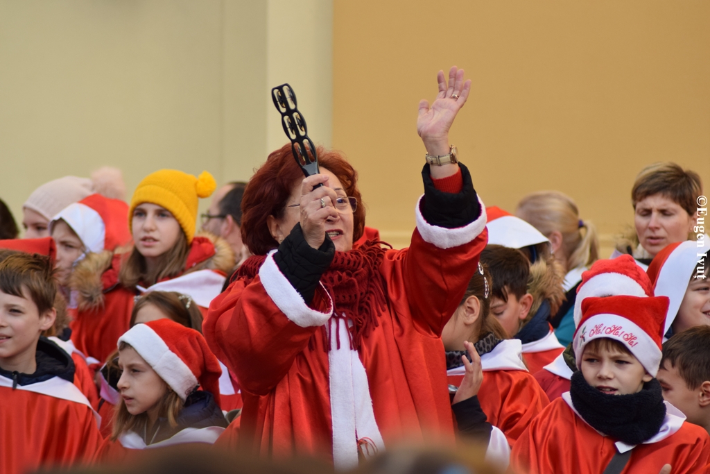 Îmbrăcaţi cu pelerine de Moş Crăciun şi „înarmaţi” cu clopoţei, copiii au colindat orădenii aflaţi în plimbare în zona centrală a oraşului Oradea. Primul popas al vestitorilor Sărbătorilor de iarnă a avut loc, conform tradiţiei, la Catedrala Sfântul Nicoale, unde micuţii au avut ocazia să-l colinde pe episcopul greco-catolic Virgil Bercea. Următoarea oprire a avut loc în Piaţa Unirii, chiar în faţa căsuţei de sticlă a celor de la Radio Zu, colindătorii benefiicind de live-uri atât la radio, cât şi pe pagina de facebook. Cei care i-au interviat pe elevi, dar şi pe directoarea şcolii, Antonia Nica, au fost chiar Flick Domnul Rimă şi Răzvan Popescu. Colindele celor mici au încântat mai apoi reprezentanţii Primăriei Oradea, cei 350 de moşuleţi aliniindu-se chiar în faţa instituţiei. În mijlocul lor a coborât de această dată viceprimarul Florin Birta. Penultimul popas a avut loc la sediul Digi24 Oradea, mai exact în faţa sediului, cele trei sute de voci fiind amplificate graţie acusticii din pasajul Palatului Vulturul Negru, spre bucuria trecătorilor.