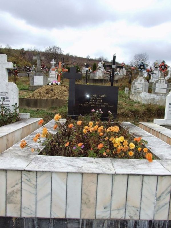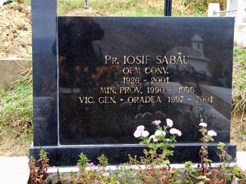Mormântul părintelui Iosif Sabău are o împrejmuirea din ciment, placată cu marmură albă. Pe un postament din marmură neagă se ridică o cruce, iar în dreapta acesteia, o placa dreptunghiulară tot din marmură neagră. Pe aceasta stă scris: “Pr. Iosif Sabău / OFM CONV. / 1926-2001 / Min. prov. 1990-1996 / Vic. gen. – Oradea 1997-2001”. În „Registrul decedaților” găsim informații suplimentare: s-a născut la 7 martie 1926, la Luizi-Călugăra; a decedat la 16 iunie 2001, la Oradea, 75 de ani, îngrijit cu sfintele sacramente. A fost preot şi frate din OFMConv., ex-provincial, vicar general al Episcopiei Greco-Catolice de Oradea. A fost înmormântat la 21 iunie 2001 în cimitirul mare din Luizi-Călugăra. La funeralii au participat: Aurel Percă, episcop auxiliar, Anton Coşa, episcop de Chişinău, Gheorghe Guţiu, episcop de Cluj, Florentin Crihălmeanu, episcop de Cluj, Virgil Bercea, episcop de Oradea, Ubaldo, episcop de Calabria, pr. Ioan Ciuraru, ministru provincial OFMConv., circa 150 de preoţi romano-catolici şi greco-catolici.