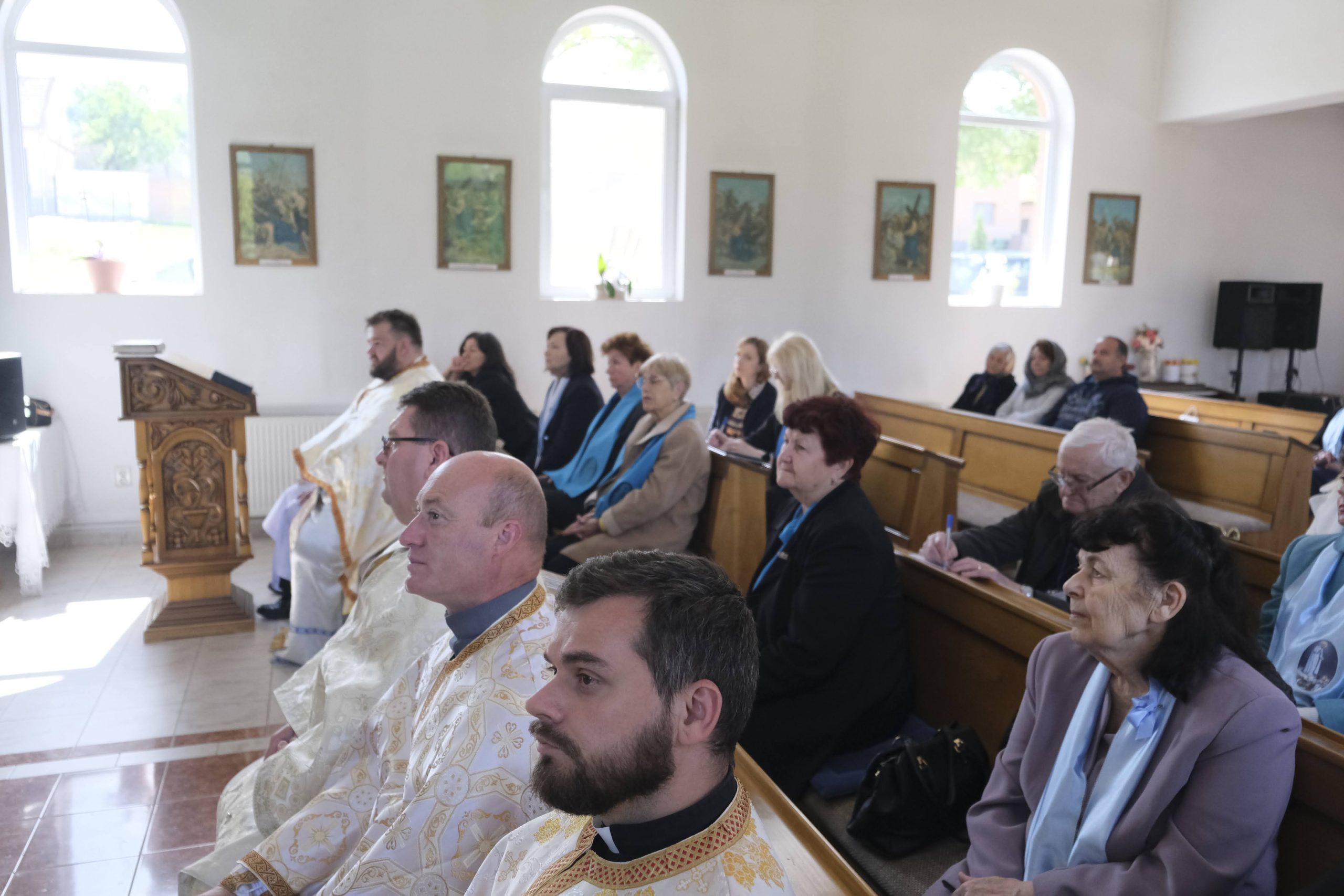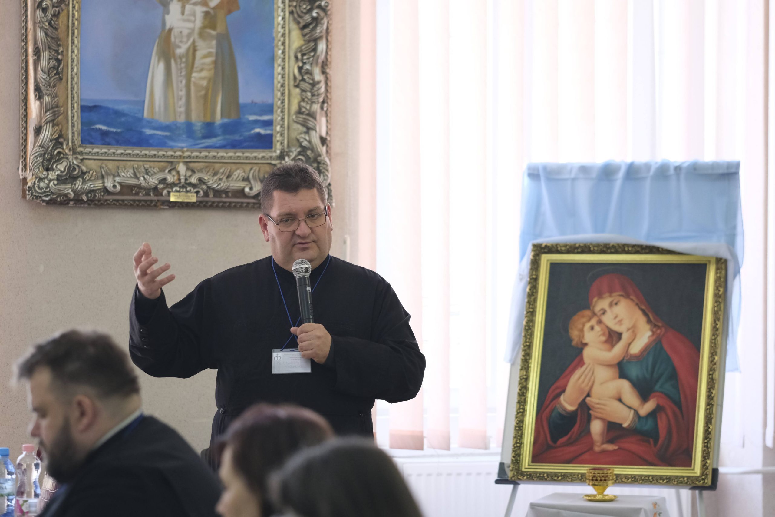 Conferinţa „Liturghia, credinţa, pietatea populară, trăită şi cultivată prin activitatea Runiunilor Mariane din Biserica Greco-Catolică” a fost susţinută de Pr. Fischer Eduard, Protopop de Satu Mare (Episcopia de Maramureş). Sfinţia sa ne-a prezetat apariţia Cultului Marian în istoria trăirii Credinţei începând cu primele secole, reliefând rolul Conciliilor Ecumenice în stabilirea unei învăţături clare, bine definită în practicarea Credinţei: