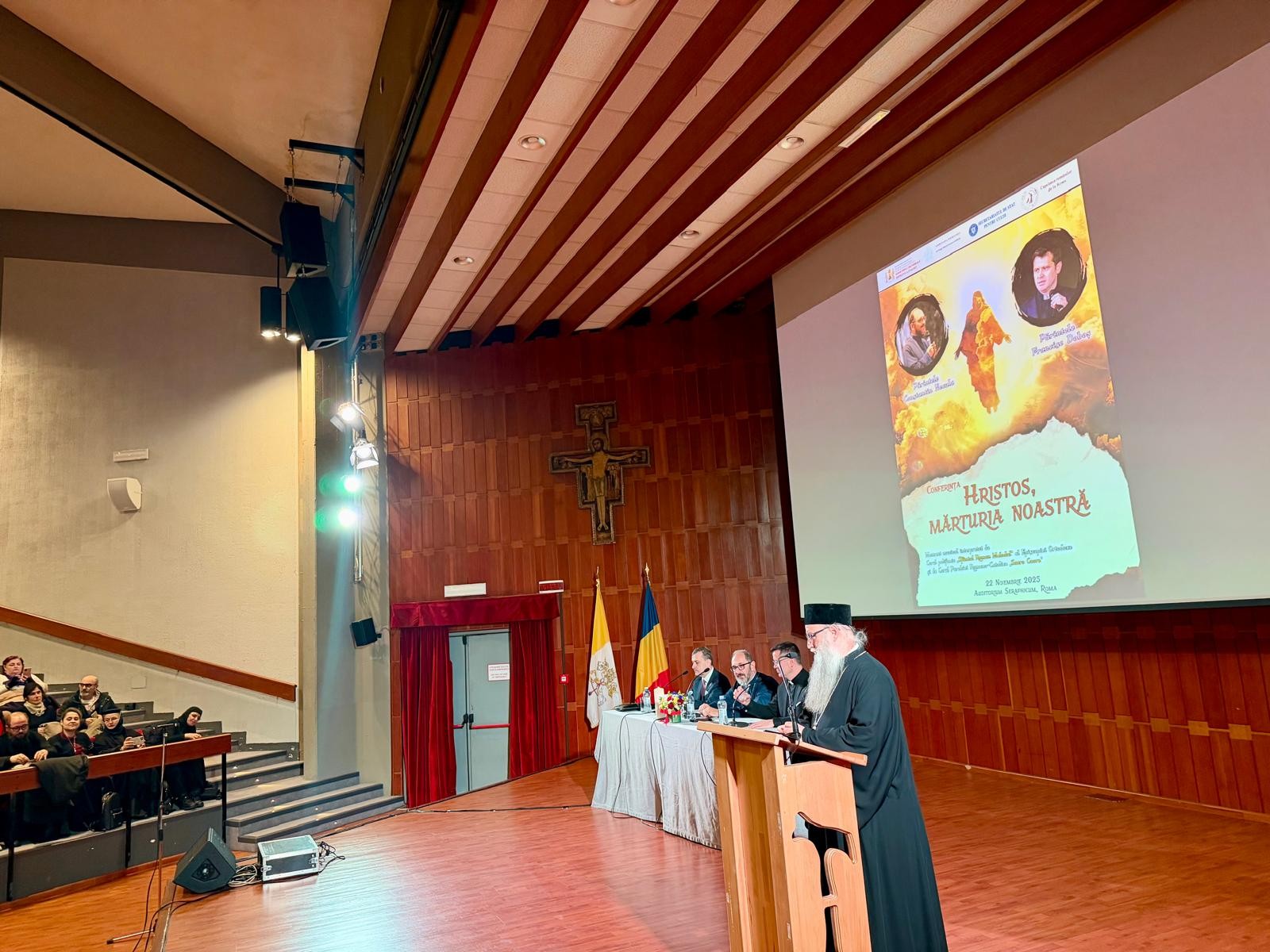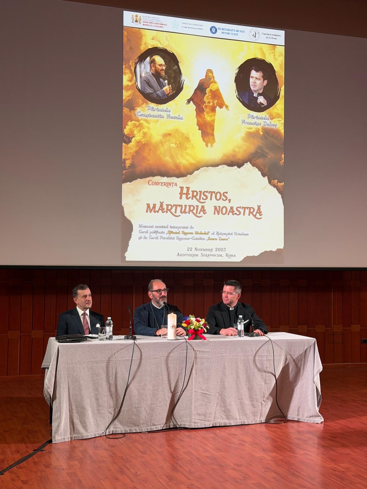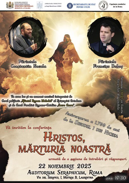 Aproximativ 500 de participanți, veniți din Italia și România, au fost prezenți la conferința „Hristos, mărturia noastră”, un eveniment multiconfesional organizat de Ambasada României pe lângă Sfântul Scaun, Episcopia Ortodoxă Română a Italiei și Capelania românilor din Roma, cu sprijinul Secretariatului de Stat pentru Culte. Conferința a avut loc sîmbătă, 22 noiembrie 2025, la Auditorium Seraphicum din Roma, și a fost dedicată aniversării a 1700 de ani de la Sinodul I Ecumenic de la Niceea – un moment definitoriu pentru dogma creștină și pentru consolidarea unității Bisericii, care a rămas un reper fundamental în istoria culturii, spiritualității și gândirii europene.