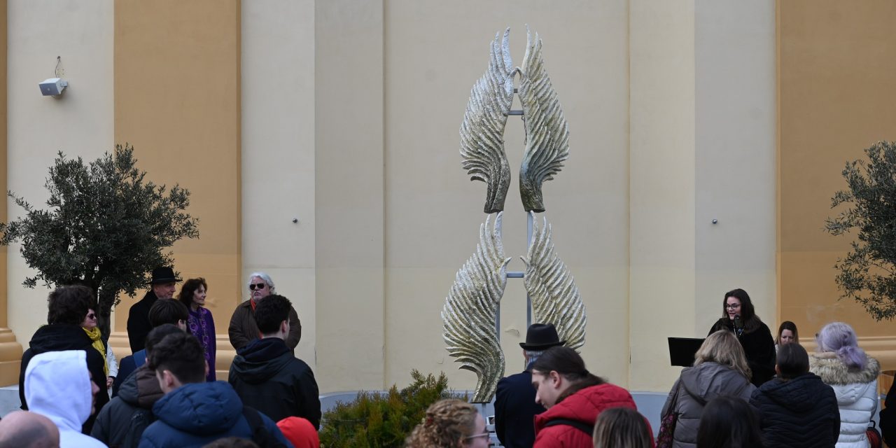 Într-o pauză, oferită de Providența divină, între cerul înnorat și ploaie, s-a desfășurat vernisajul instalației Aripile Libertății semnată de sculptorul Andrei Marina-Voith.